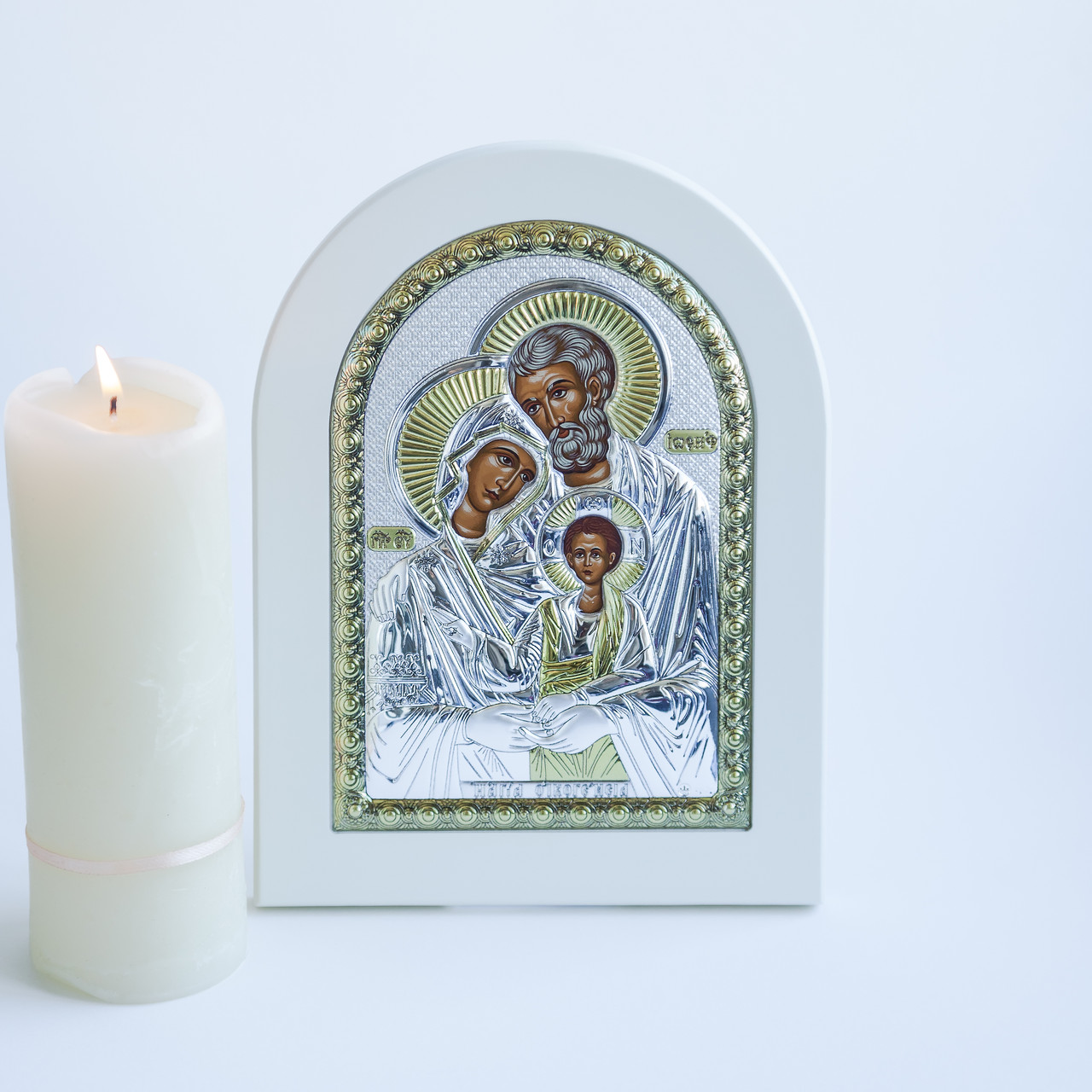 Ікона Свята Сімейство з позолотою арка біла- дуже шанований образ у християнстві, оскільки покровительствує всім. Асоціюється це обличчя, природно, з сім'єю та шлюбом, але сім'я та дім є у кожної людини, тому ця ікона допоможе кожному, хто б до неї не звернувся. Вважається, що Свята Сімейство допоможе відновити будь-яку несправедливість по відношенню до людини, зможе відновити втрачені сімейні узи між родичами, що ворогують, утихомирити гординю, повернути борг, не тільки матеріальний, нейтралізувати зовнішніх ворогів.