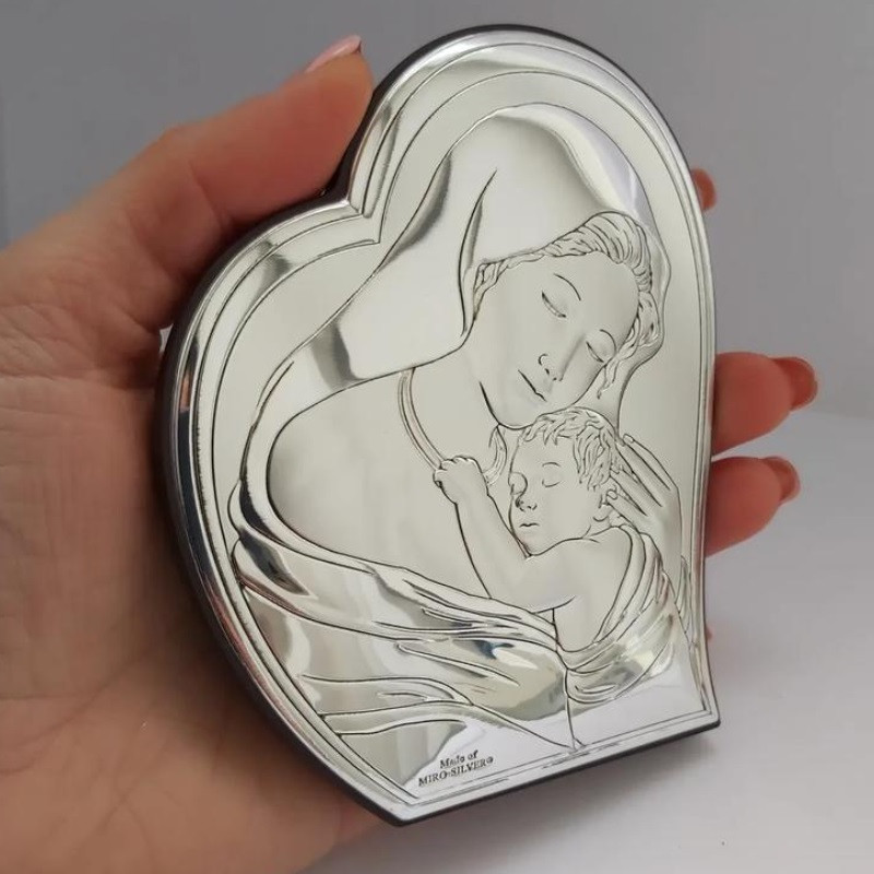 Темний оклад символізує глибину вічності, таємницю Божественного і священний простір, в якому перебувають святі. Підкреслює світлий образ Богородиці, створюючи ефект духовного сяйва, немов з темряви світу пробивається небесне світло. Естетично підходить до інтер'єру з класичними, дерев'яними або строгими тонами. Ніжне зображення, м'які лінії, витончені риси і світла кольорова палітра облич і одягу роблять ікону доступною і близькою для дитячого сприйняття. Такий образ викликає довіру, умиротворення і відчуття захищеності. Це створює м'який, емоційно теплий образ, на відміну від строгих класичних ікон. Підходить для оформлення дитячої кімнати, створюючи затишок і атмосферу доброти для вашої дитини. У виробі немає гострих кутів, тому його можна давати в руки, не боячись поранити малюка. Покриття образу містить у своєму складі срібло 925 проби, тому його можна давати навіть пробивати «на зуб». Святий образ всередині буде охороняти сон немовляти і служити оберегом для дитини старшого віку. Універсальний виріб прекрасно підійде як хлопчикові, так і дівчинці, завдяки нейтральній основі. Красиве ніжне зображення — буде розбурхувати візуальне сприйняття дитини. Як тільки вона почне задавати питання, ви зможете посвятити її в усі релігійні таїнства.